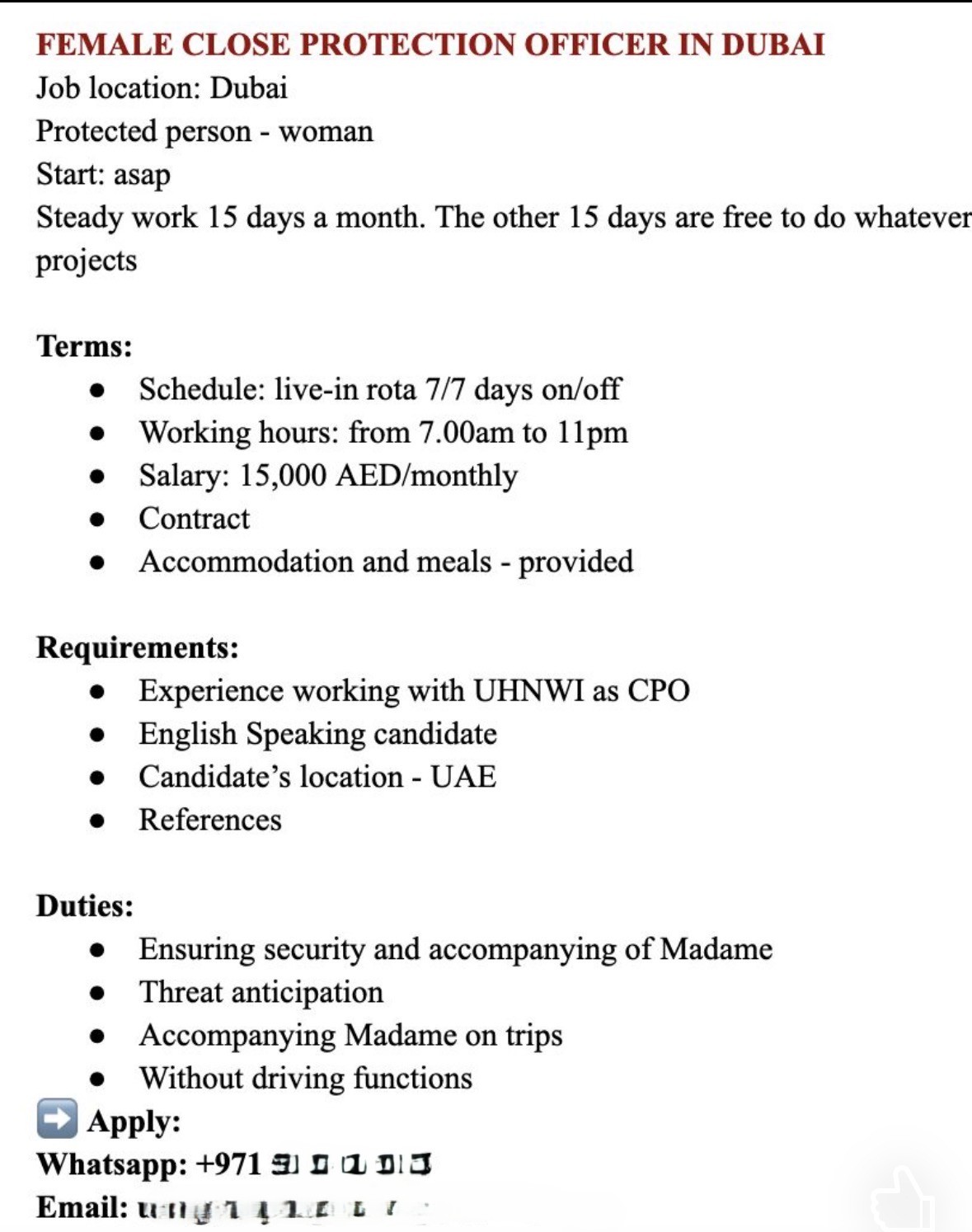 本稿で取り上げる募集要項も、そうした文脈の中で LinkedIn 上に掲載され、警護業界の実務者間で話題となった事例である。提示されている条件は一見すると魅力的であり、海外案件、UHNWI対応、生活費負担といったキーワードは、警護業界に身を置く者であれば少なからず関心を抱く要素であろう。