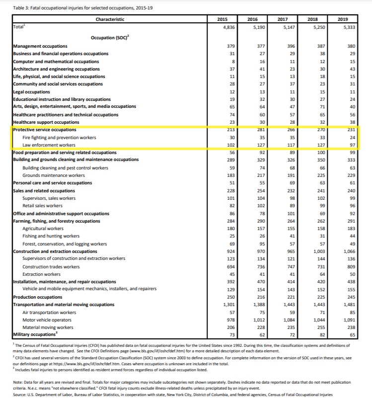 アメリカのBureau of Labor Statistics(BLS)が発表した「National Census of Fatal Occupational Injuries in 2019」によると職業別死亡災害発生状況で最も死亡者数が多い職業は、Transportation and material moving occupation(運輸業)で1301名、次に多かったのがConstruction and extraction Occupations(建設業)で924名でした。従事者の数が異なる為、単純に比較することは出来ませんが、銃社会のため死亡者数が多いと思われがちなアメリカの警察でも、実はそこまででもなく2019年に死亡した警察官の数は102名で運輸業や建設業と比べるとさほど多くありません。警備業に関してはランクにも入っていませんでした。